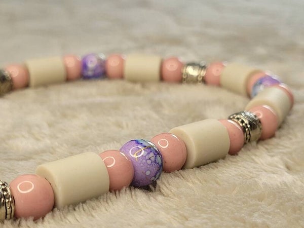 Deze tekenband emx is uitgevoerd met kralen in roze en paars. Ook zijn er sierlijke zilverkleurige spacers aan toegevoegd.