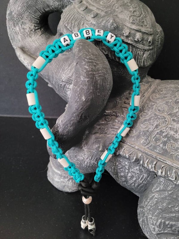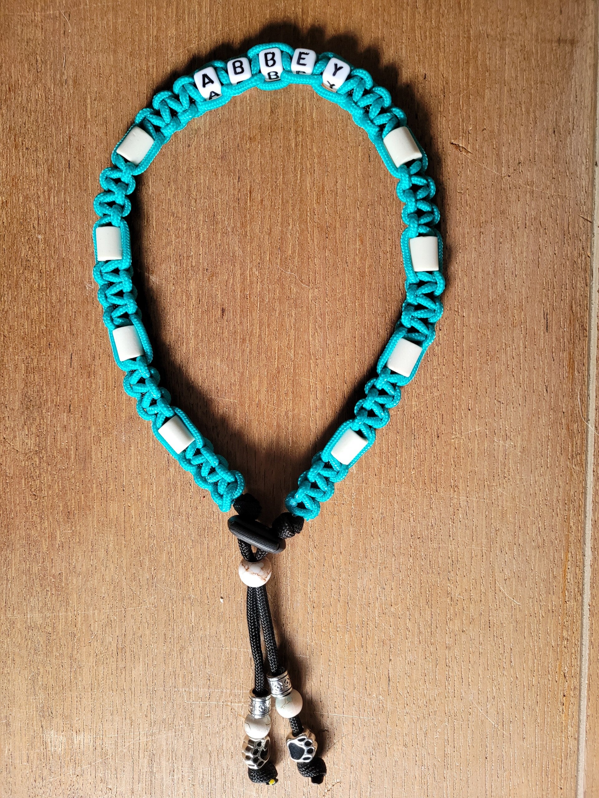 Ook voegen wij de naam naar keuze in letterkralen toe aan de halsband.