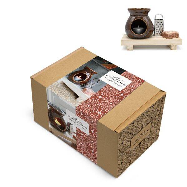 Deze bruine cadeauset bevat een amberblokje, een waxwarmer, een mini rasp en een onderzetter en is verpakt in een stijlvolle cadeauverpakking.