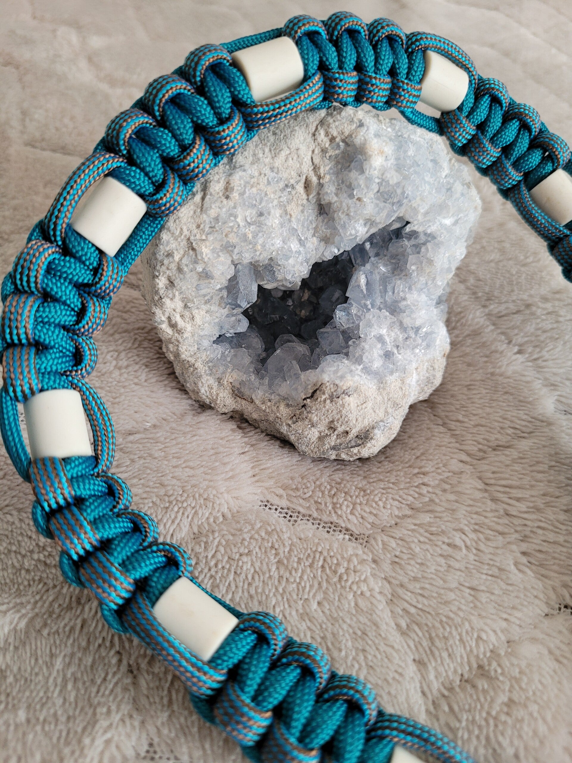 De kralen zijn geregen op sterk paracord.