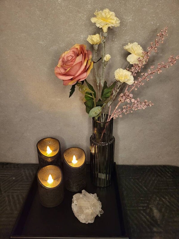 Plaats het boeket solo of maak een sfeervol arrangement op een plateau met (led)kaarsen, amberblokjes en/of edelstenen. Ook verkrijgbaar bij more2choose.