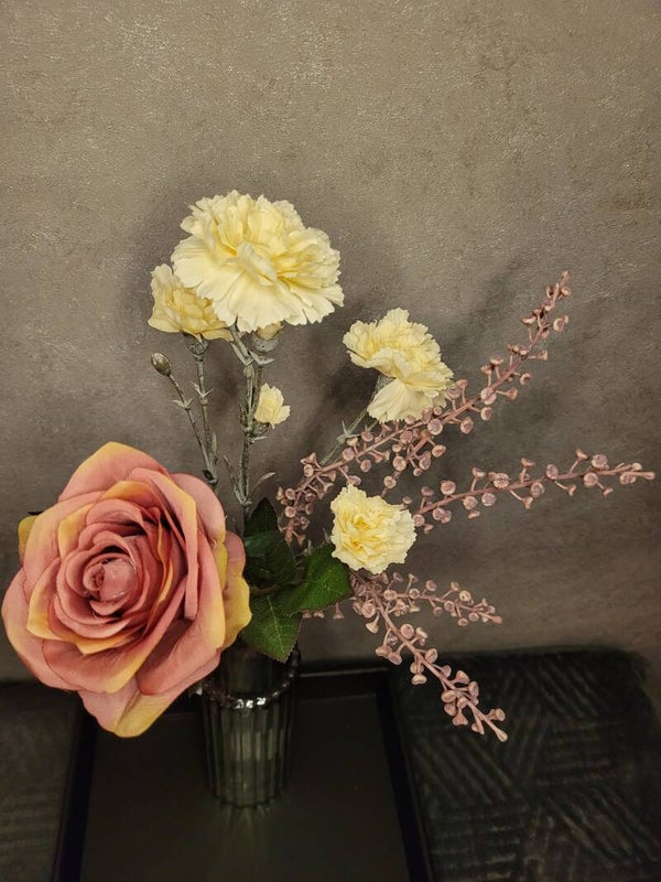 Een stijlvol boeket van kunstbloemen inclusief vaas. Het boeket bestaat uit een selectie kunstbloemen zoals een dianthus (anjer), roos en pokeberry spray van goede kwaliteit