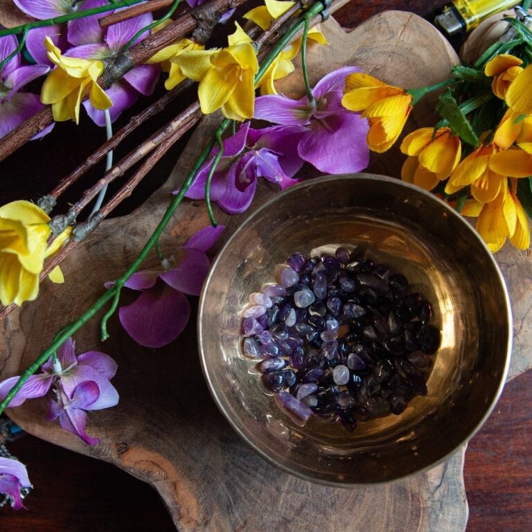 Amethist trommelsteentjes in een gekleurd organza zakje.