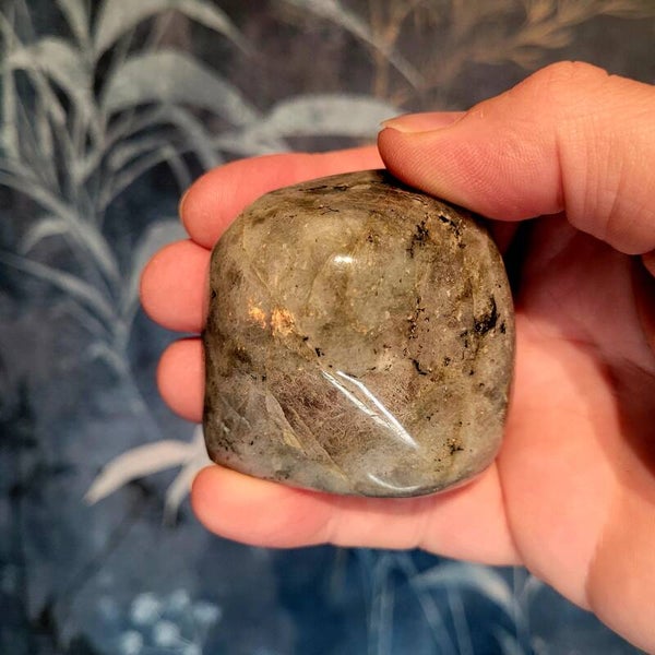 Een vrije vorm Labradoriet stuk met roze flash.