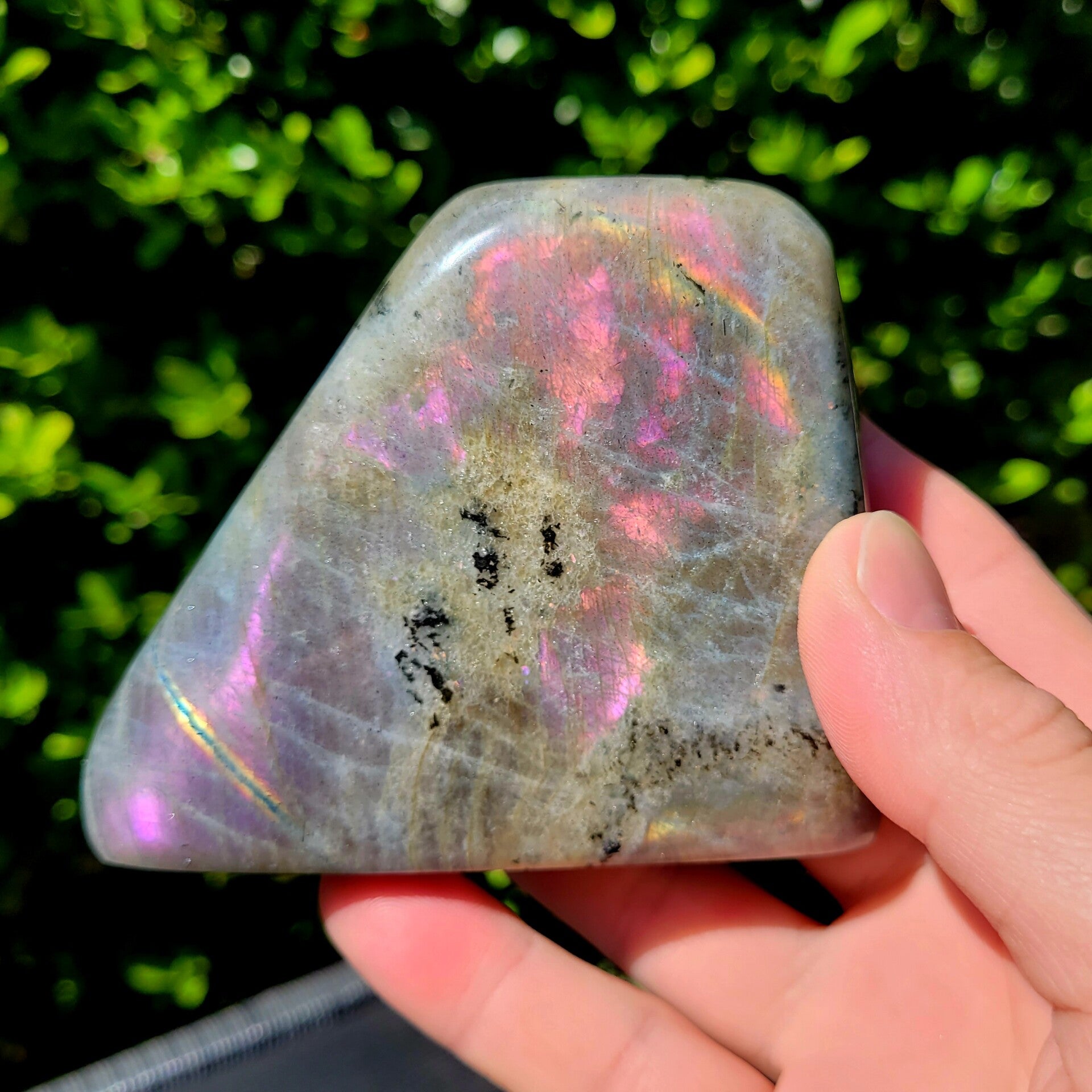 Een vrije vorm Labradoriet stuk met paars, roze en gele flash.