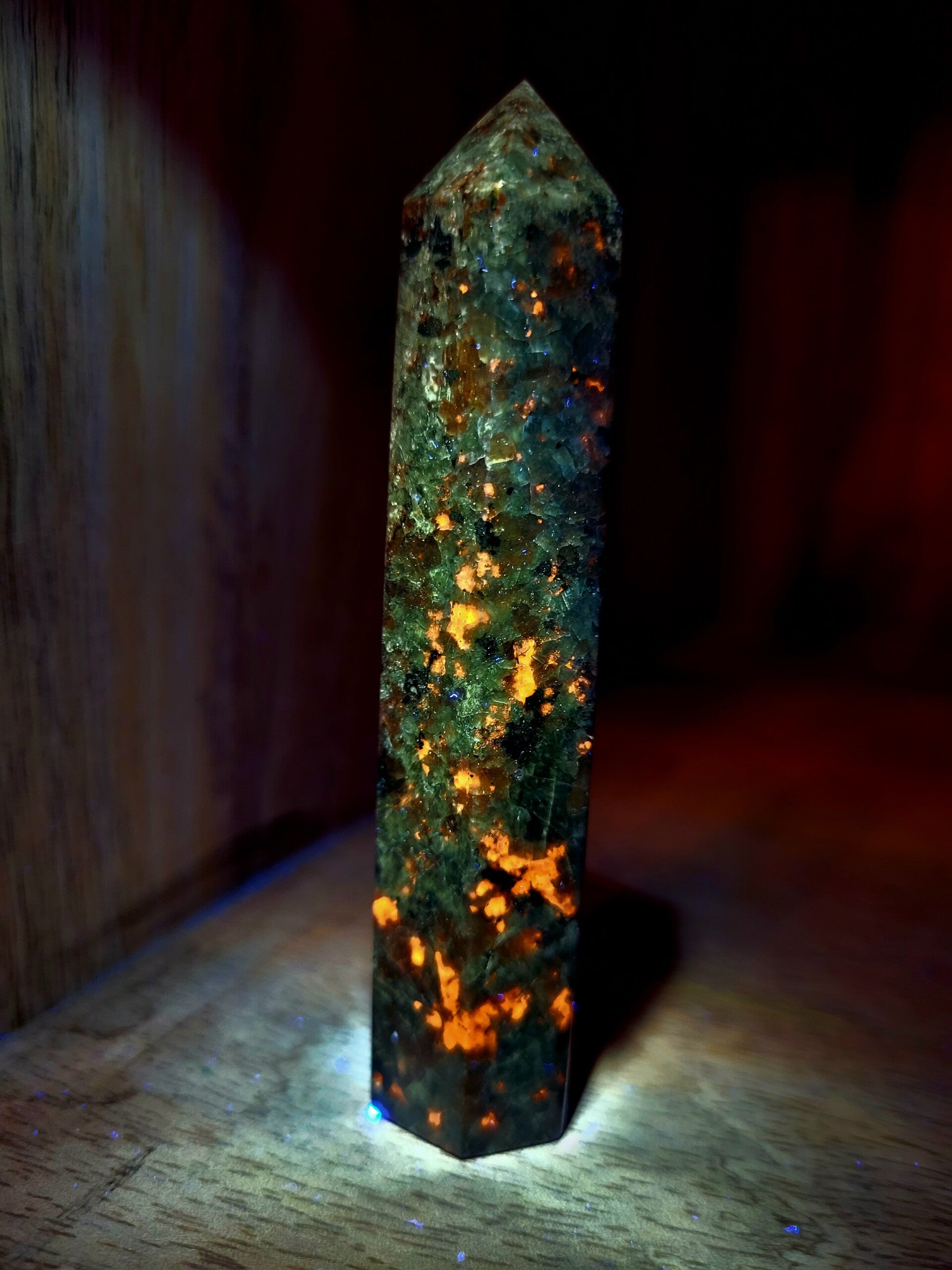 Deze toren van Yooperlite is 10 cm hoog en 2 cm breed.