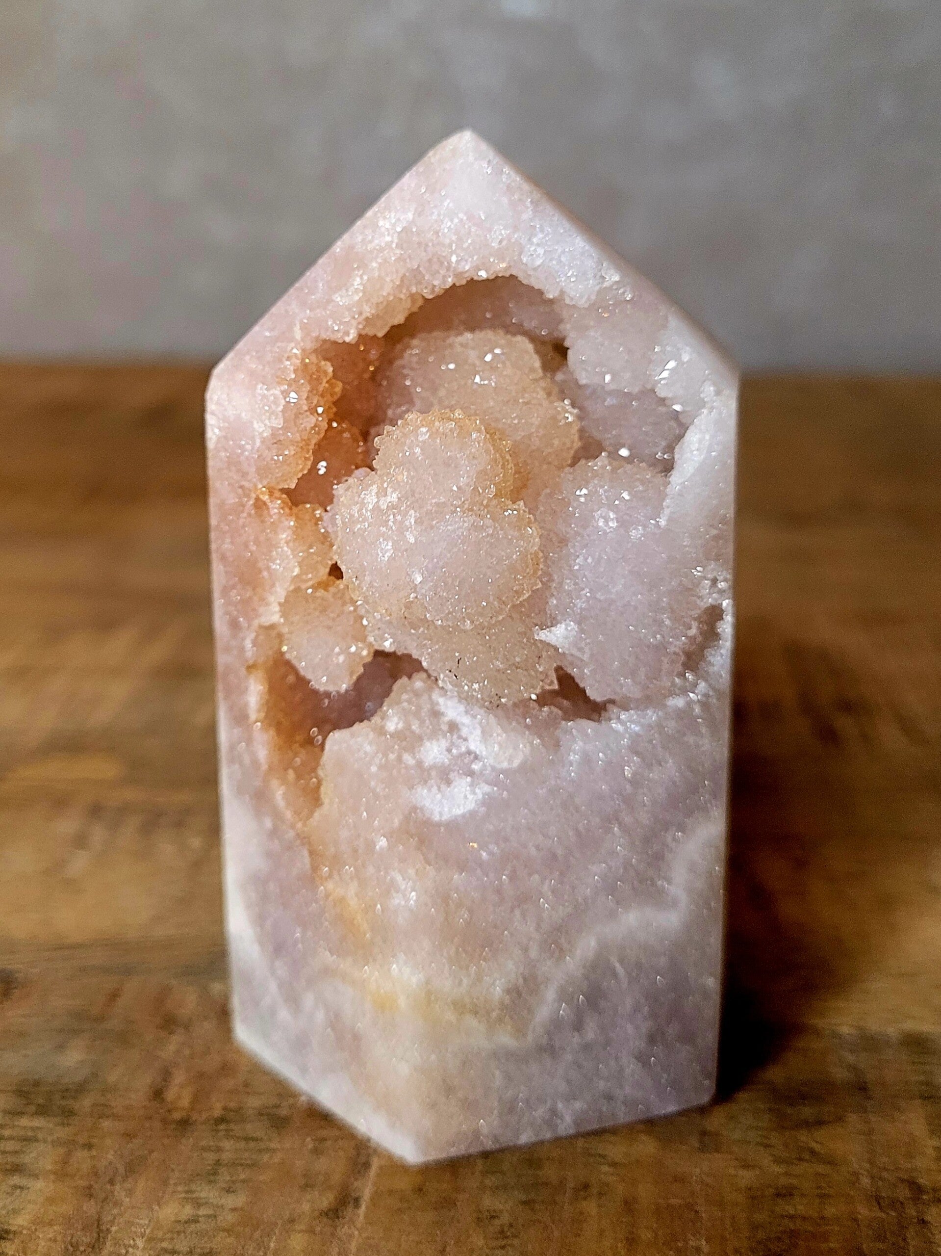 Mooie roze amethist toren, met veel druze en kristalvorming.