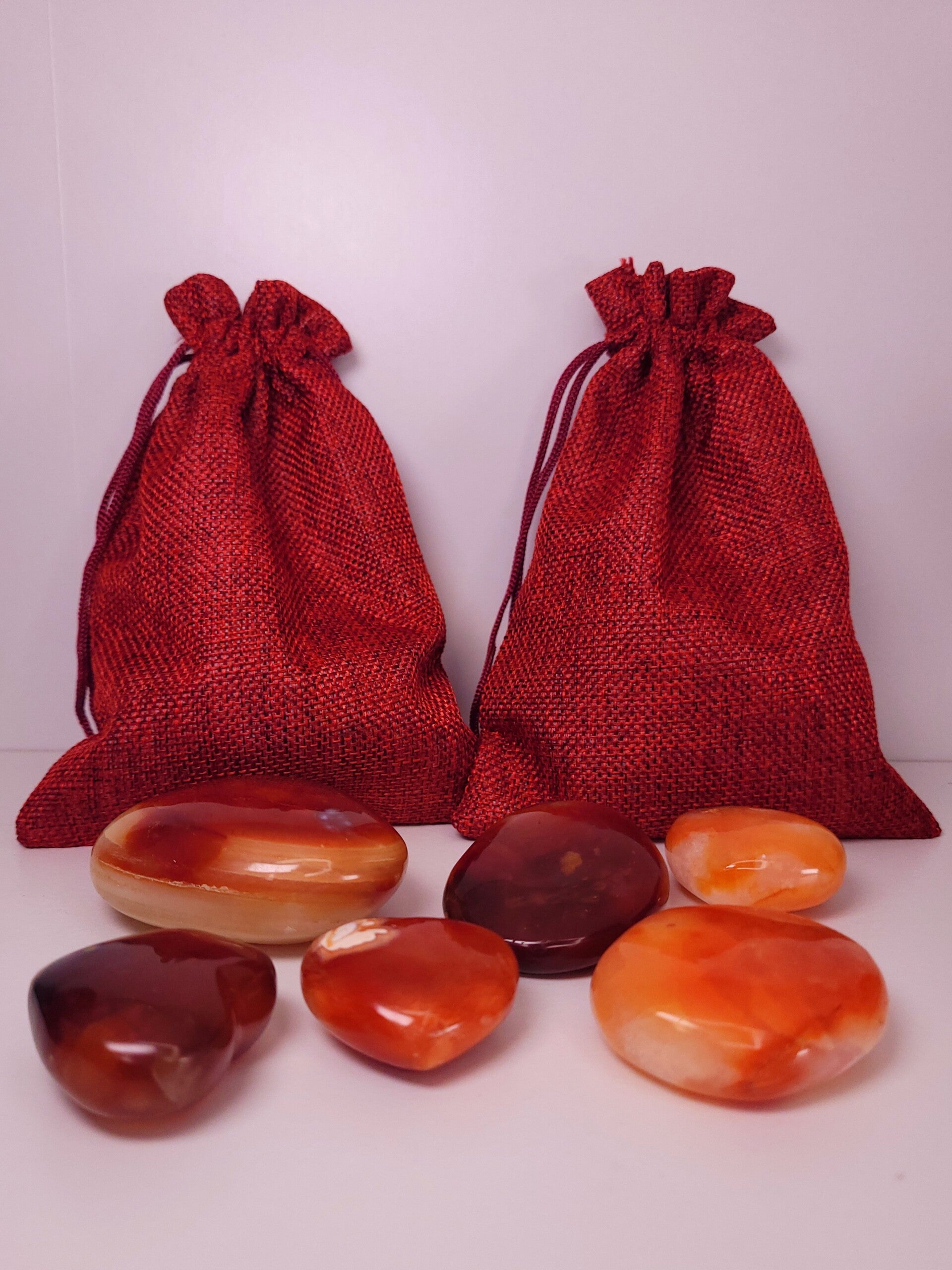 Cadeautasje met carneool palmstenen en carneool hartjes.