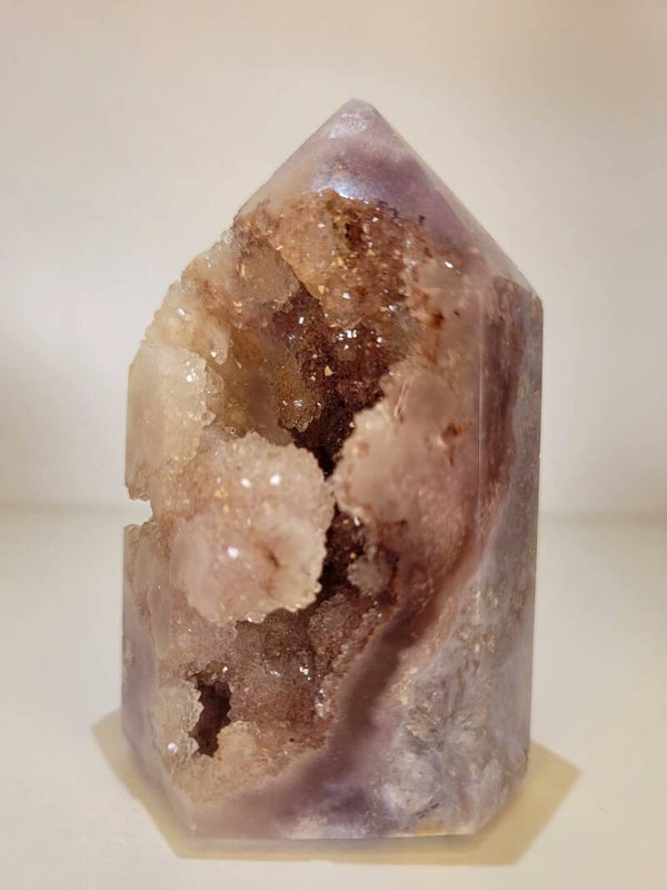 Druzy roze amethist (chalcedoon) toren met prachtige kristalvorming binnenin en een doorkijkje.