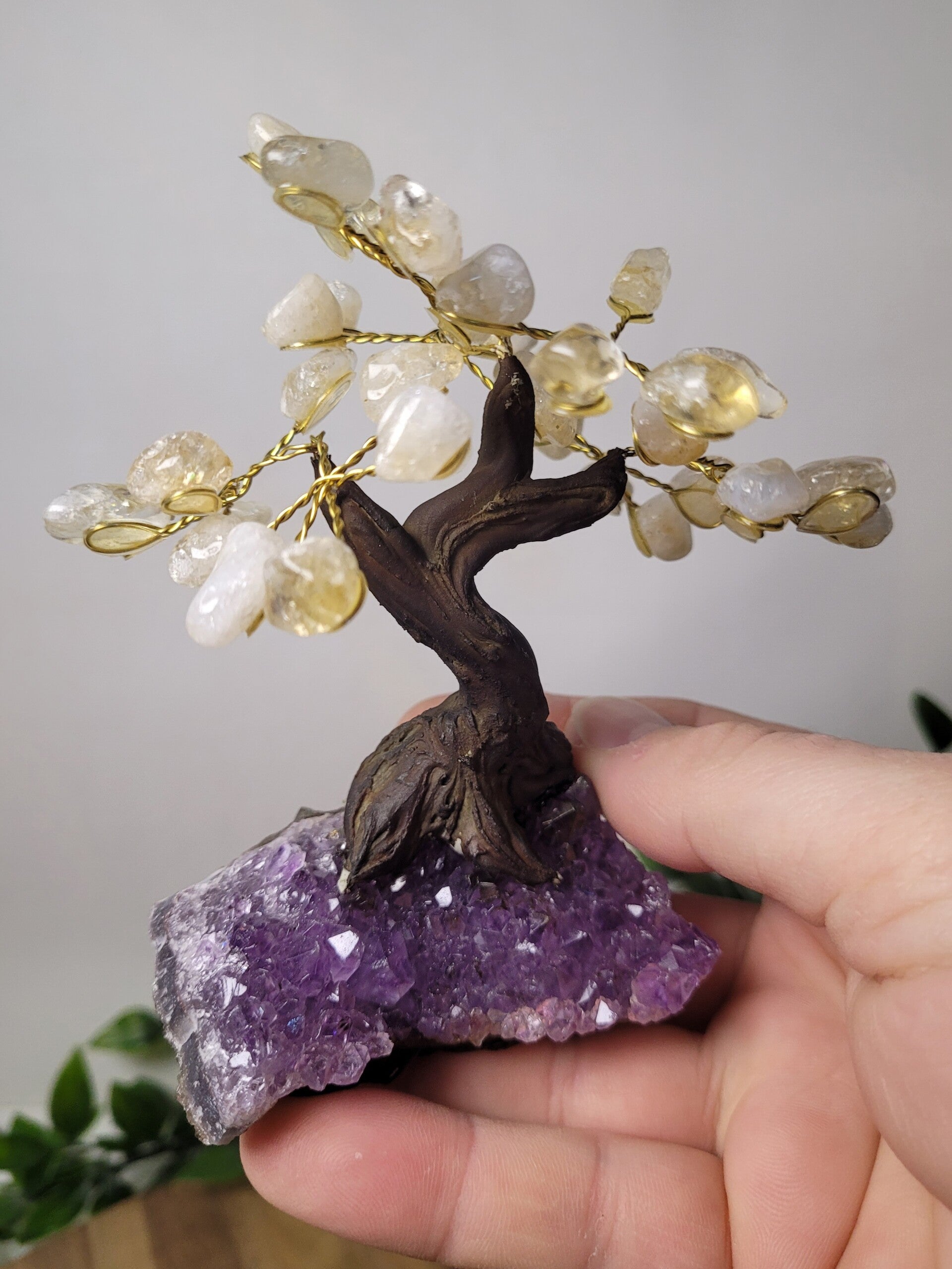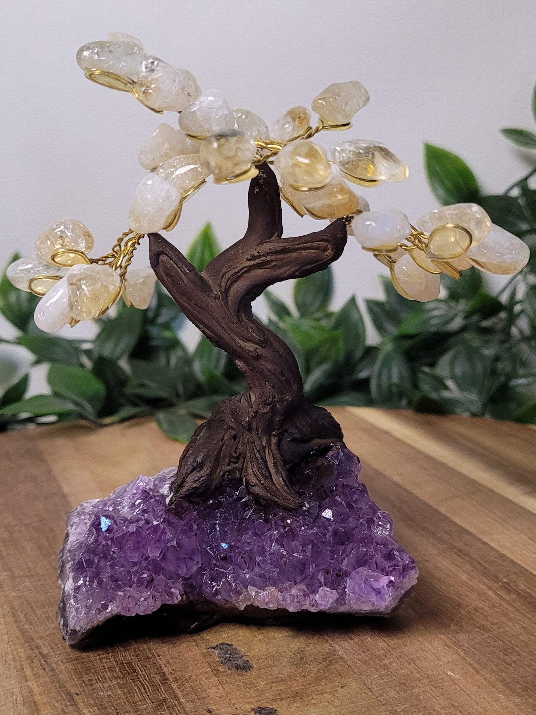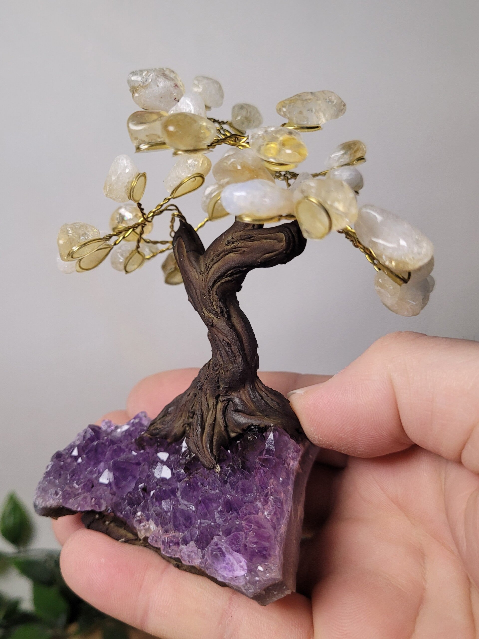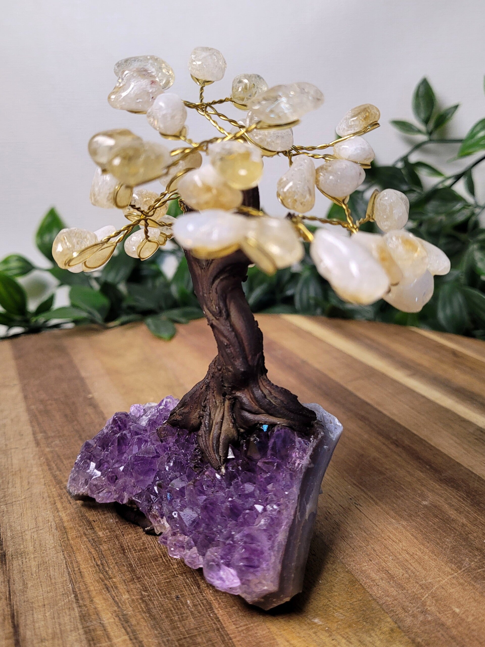 Edelsteen Boom van Citrien Tromeelsteentjes op een amethist voet.