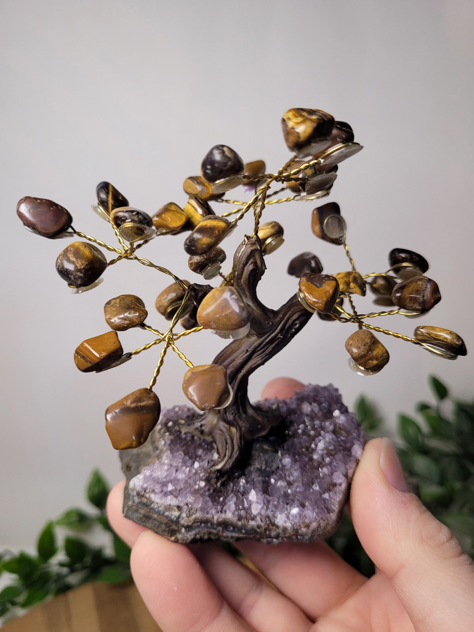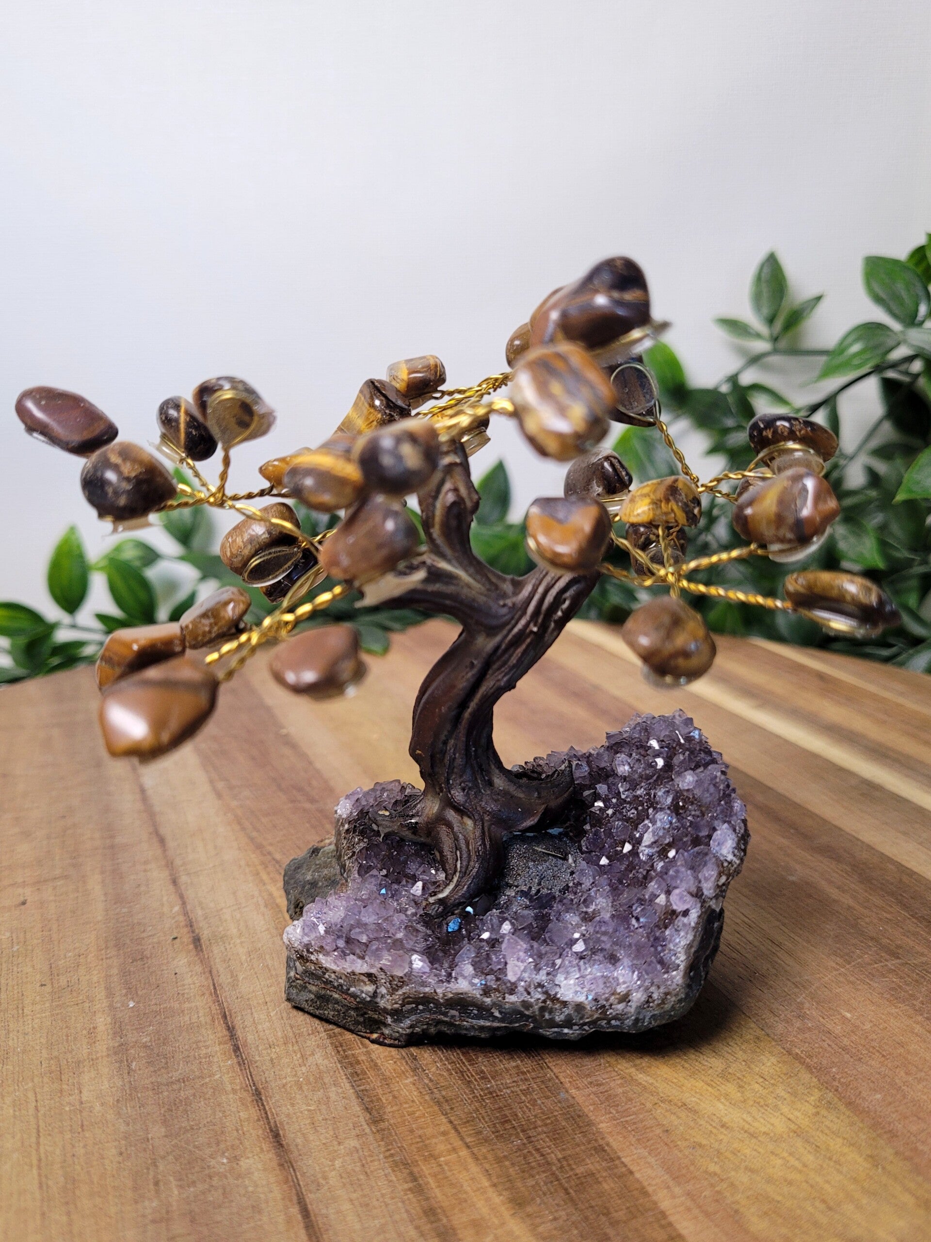 Edelsteenboom met tijgeroog trommelsteentjes op een amethist voet.